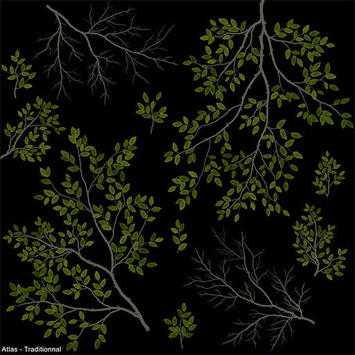 There's no need to bake atlases with dozens of different branch stages, just a few small branches are enough. Not only does this reduce the number of elements in an atlas, it also means that the elements can be made larger, thus enhancing their quality. As the elements are larger, their resolution is also higher, which reduces the “blurring” present on atlases with too many elements or where the size of the elements is not respected.