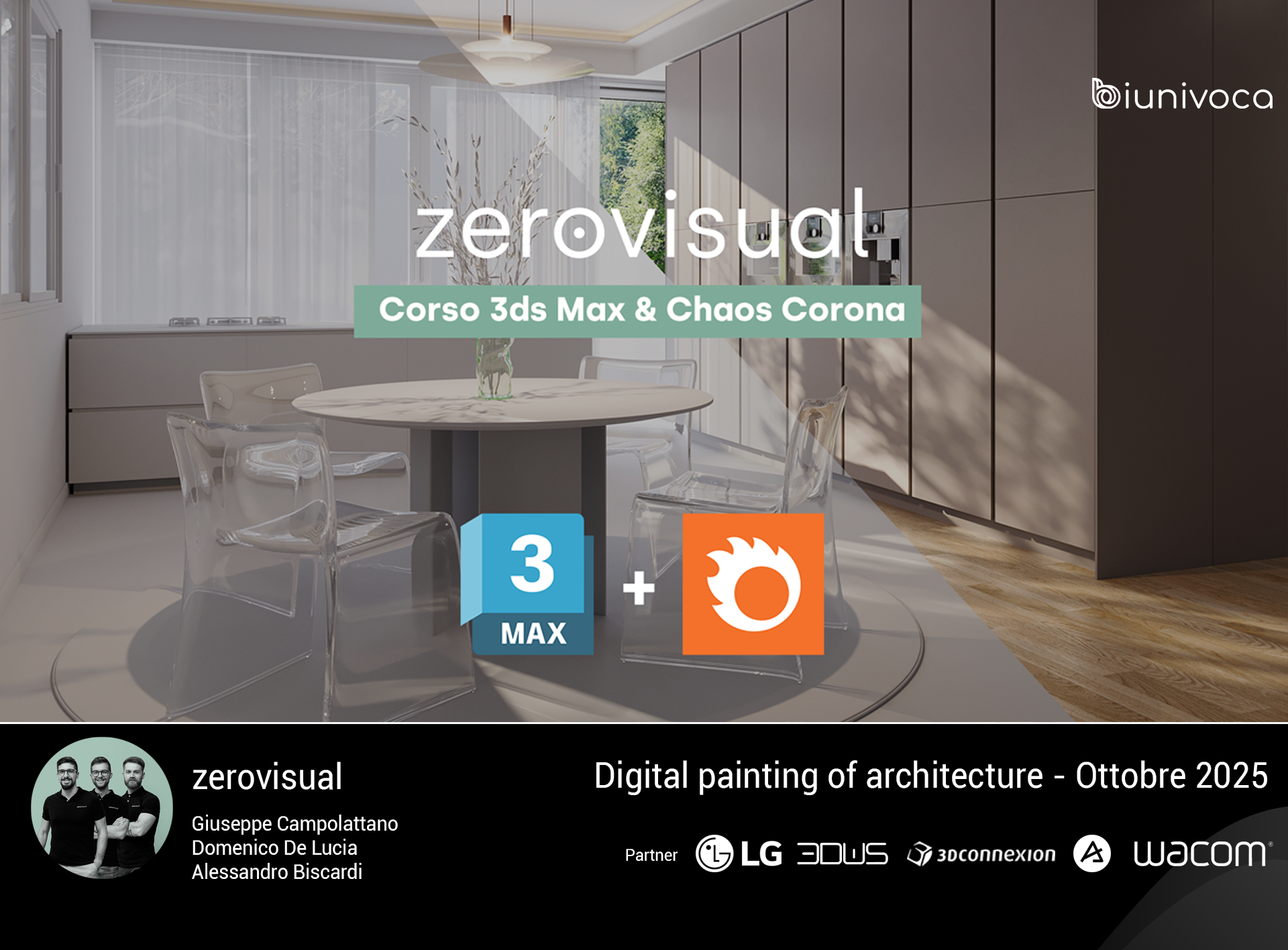 Siamo il team di zerovisual, e questo è il nostro corso per principianti basato su 3ds Max e Chaos Corona in collaborazione con Biunivoca.